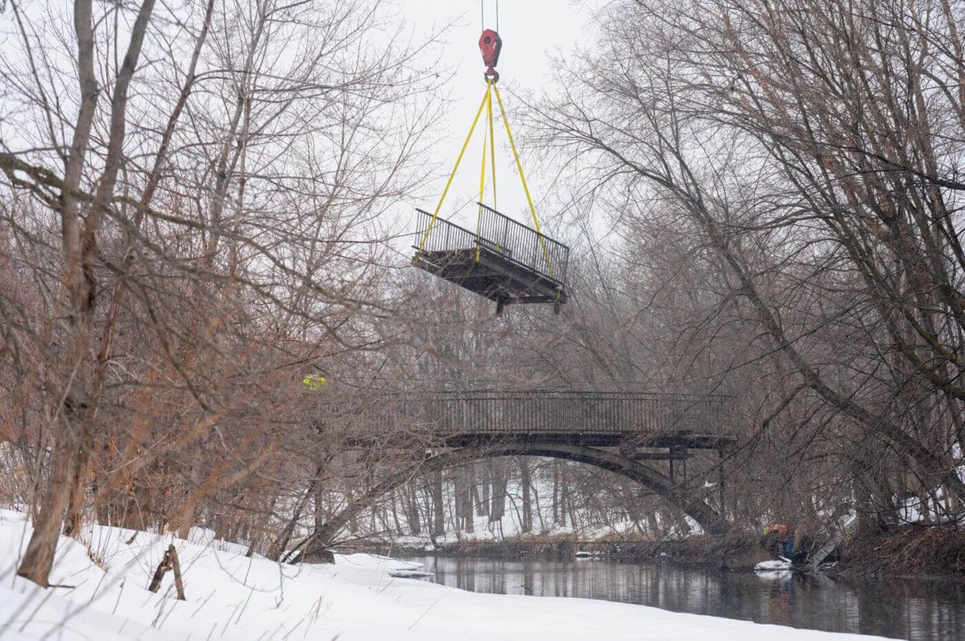 The pedestrian bridge over Minnehaha Creek near 36th Avenue S was removed for repairs yesterday, March 9, 2023. New foundations will be installed this spring while the bridge is moved offsite, where it will receive a new timber deck and paint.