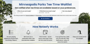 We are excited to announce the launch of our new virtual Tee Time Booking Assistant. To try it out, go to Minneapolis Golf Tee Time Waitlist, select your date, time, number of players and preferred courses, and get a text and email when your desired tee time comes available.