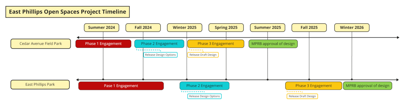 In fall of 2025 MPRB will be releasing a draft preferred design for East Phillips Park and will be doing a final round of engagement to ensure the design is community vetted before bringing the design to the board later in 2026.