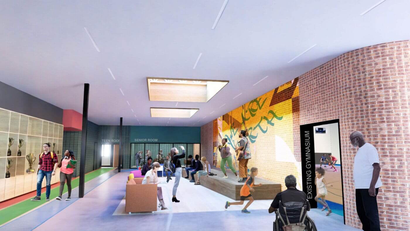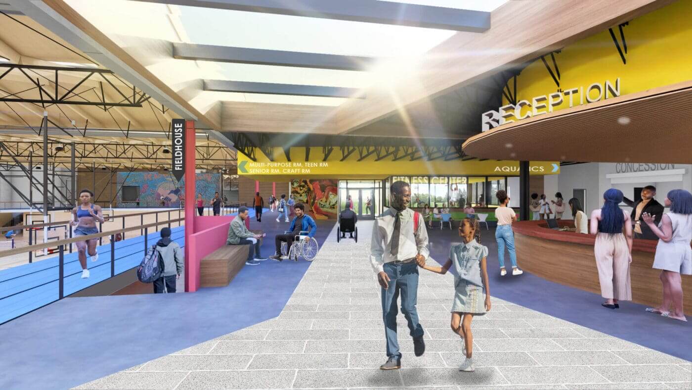 February 2024: Aerial View | Aerial View – Winter | North Plaza | South Plaza | Entry Lobby looking South | Fieldhouse looking North | Fieldhouse from Track | Multipurpose Room | Craft Room | Existing Gymnasium | Lounge | Entry Lobby looking West | Wellness Room | Water Park Activity Area | Water Park Aerial View | Water Park Lap Pool View