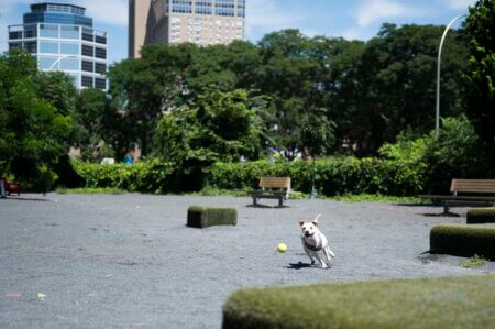 Dog chasing a ball at Gateway Off-Leash Dog Park
