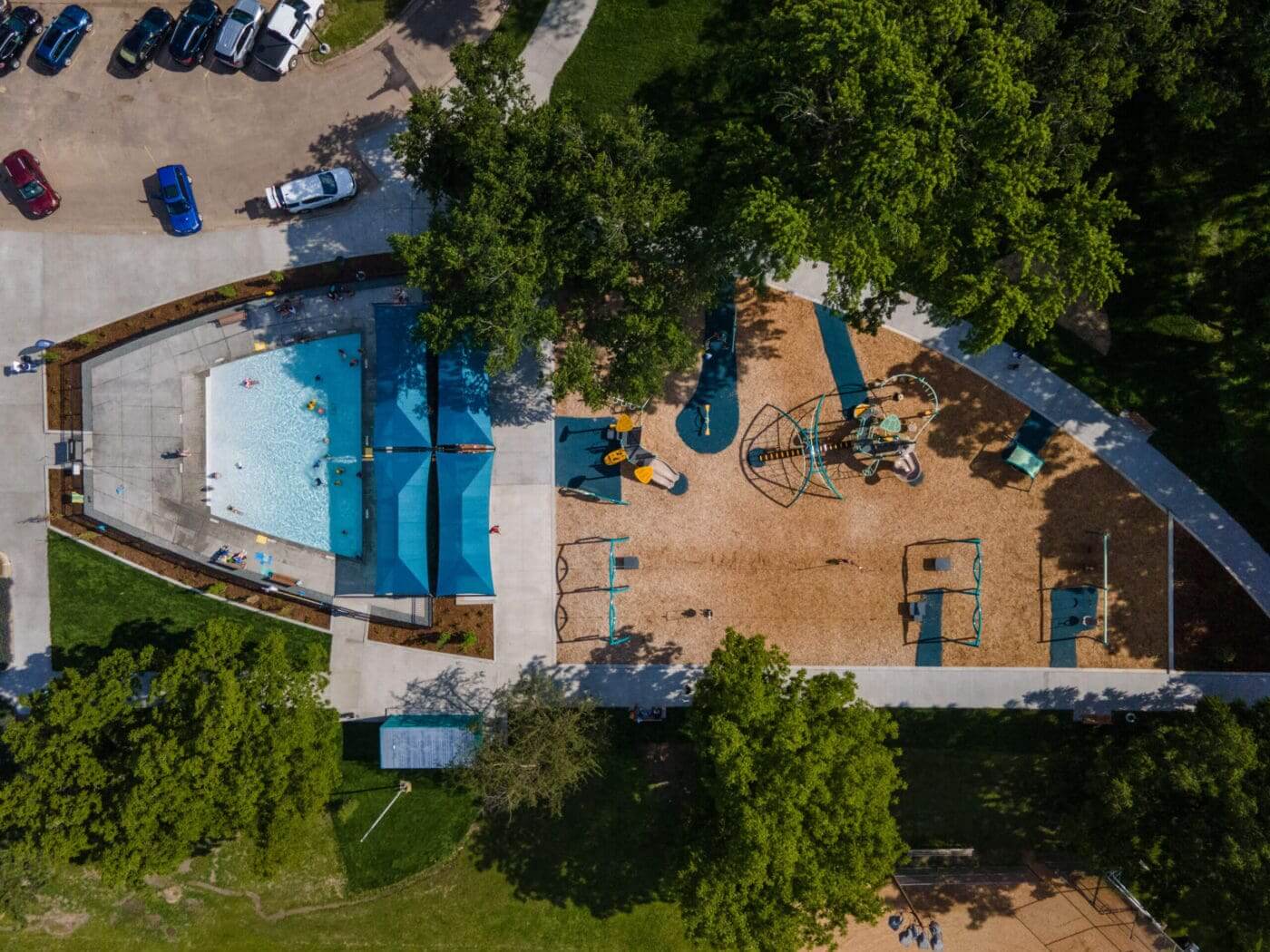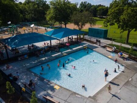 Bird’s-eye view of 40th Street Park Wading Pool, where shade structures and a spacious pool offer plenty of ways to beat the heat. See our other wading pool locations.