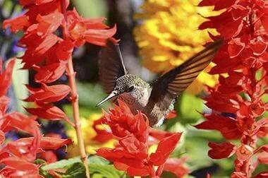 Hummingbird on Salvia "Bonfire" at Longfellow Gardens