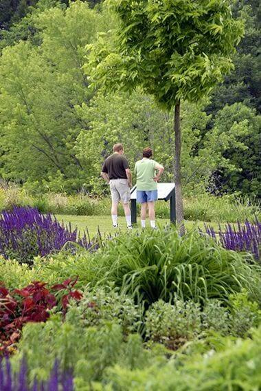 Subtle changes as plants mature throughout the season make each visit special. Each year new annual designs complement the trees, shrubs, and perennials that grace the garden area.