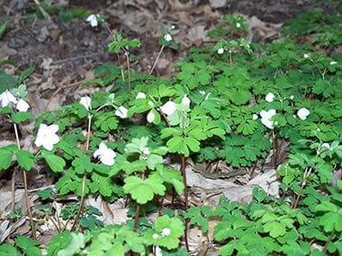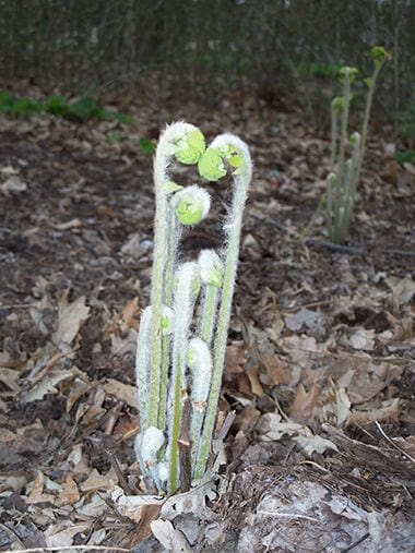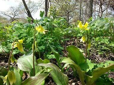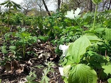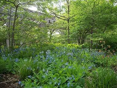 The woodland area is always in the process of change. In the spring, before the trees have leafed out, the spring ephemerals have access to full sunlight and are able to flower and reproduce before going dormant for the rest of the season. During spring and summer, this part of the Garden is shaded and feature many native shade-loving perennials. Look for: