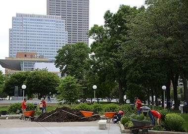 Name: When the park was first envisaged in 1908 it was viewed as a “gateway” to Minneapolis because of its proximity to the train depots. The Gateway would have been one of the first things seen by arriving passengers as they moved from the train stations toward downtown. The name, which had arisen “spontaneously” according to park board proceedings, was officially adopted December 7, 1908. Suggestions were made later to change the name to “Gateway Park” or “Gateway Plaza.”