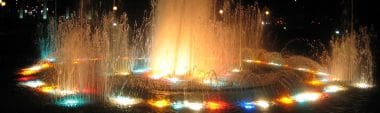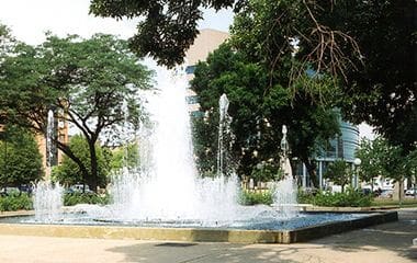 The Gateway Fountain illuminates with color nightly, greeting all who visit the City of Lakes.