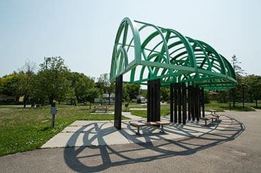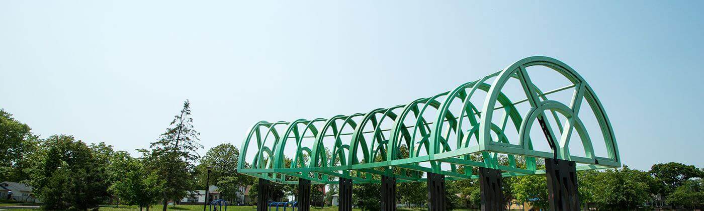 The arched green pergola is Jordan park's most distinctive feature.