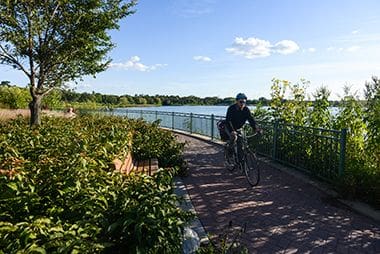 Enjoy a stroll by the lake along Lake Hiawatha Park's paved walking trails.