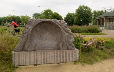 The “Listening Vessel” sculpture by Minneapolis artist Craig Davis was dedicated in 2009, and is located on the North side of the recreation center. It’s a granite sculpture depicting a parabola – an interactive listening device in the shape of a concave semi-sphere. The sounds from the lake, such as wind, waves, waterfowl and other sounds of the city are amplified to the listener’s ear. The work encourages viewers to explore the natural environment of Lake Hiawatha, as well as their own inner musings and imagination. The sculpture measures 74” x 120” x 24”.