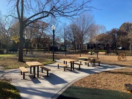 The playground and plaza in the park were improved in 2001; in 2023, a capital project was completed using equity-based funds from the 20-Year Neighborhood Park Plan. It included a new and expanded playground with safety fencing and surfacing to meet current ADA standards, along with a picnic area and drinking fountain; paths and ADA pedestrian ramps; benches, bike racks and bike fix-it station; and pollinator-friendly restored turf areas and plantings.