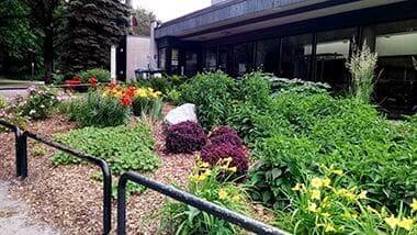 A small raised garden bed provides hands-on educational gardening activities for youth.