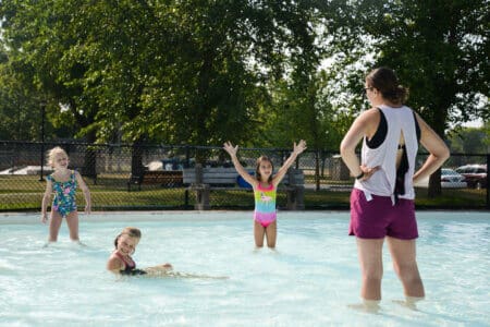 Youth participate in an aqua yoga class in the wading pool at Armatage Park.