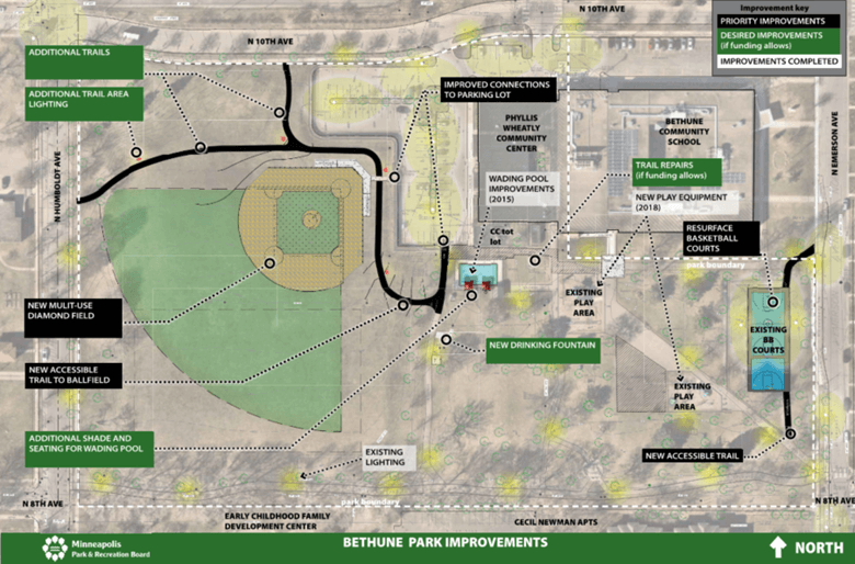 The Minneapolis Park and Recreation Board (MPRB) is pleased to announce that construction of planned field and site improvements at Bethune Park will begin this summer.