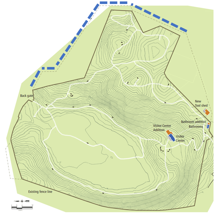 The fencing upgrades for both years are part of a broader, ongoing improvements project at the Garden. In the map below, gray dashed lines indicate the general location for the upgraded fencing, which expands the Garden by about one acre; the heavy blue dashed lines indicate sections being installed this fall along the Garden’s north and east sides.