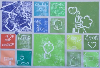 Youth were invited to cut out their own designs and then, using a steamroller, prints were made for the youth to keep. Their designs are now on view in the banner hanging in Currie Park on the new restroom building. A permanent artwork commissioned through the City of Minneapolis’ Art in Public Places program will be installed next year in the same space. |