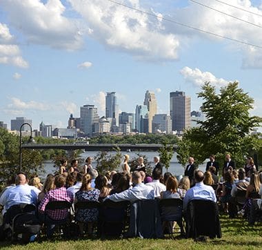 Olson Park features spectacular views of the river and skyline, well-kept green spaces, and walking and cycling paths along the Mississippi