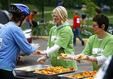 Volunteers Serving Food to Bicyclist
