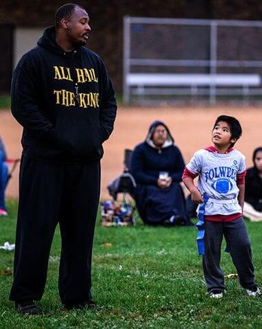 Volunteer Flag Football Coach Talking with Young Player