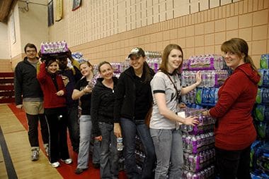 Tornado Recovery Volunteers Stacking Water Bottles